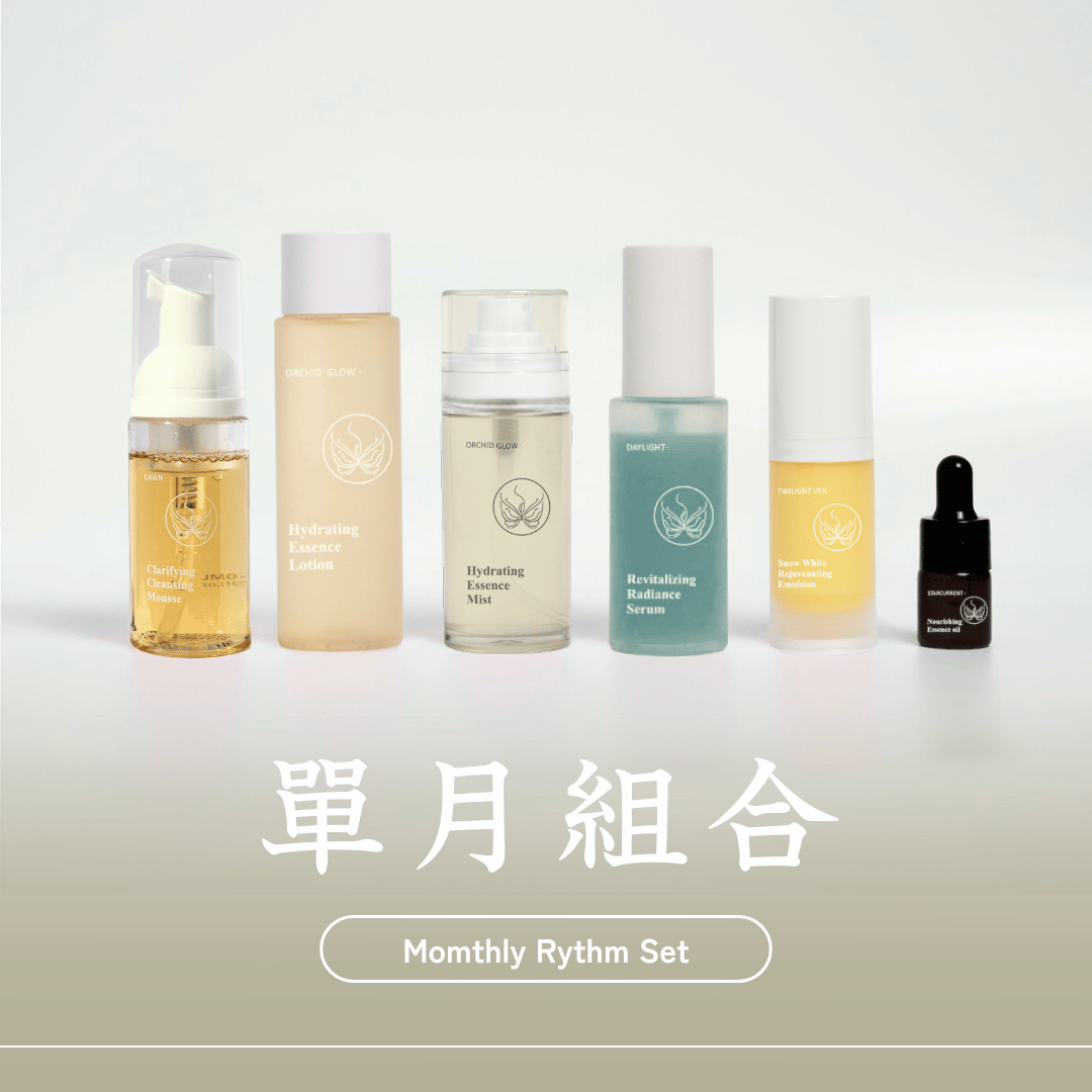 一組完整當月配方,包含潔顏慕絲、精露、噴霧、精華液、精華乳與精華油六件單品。